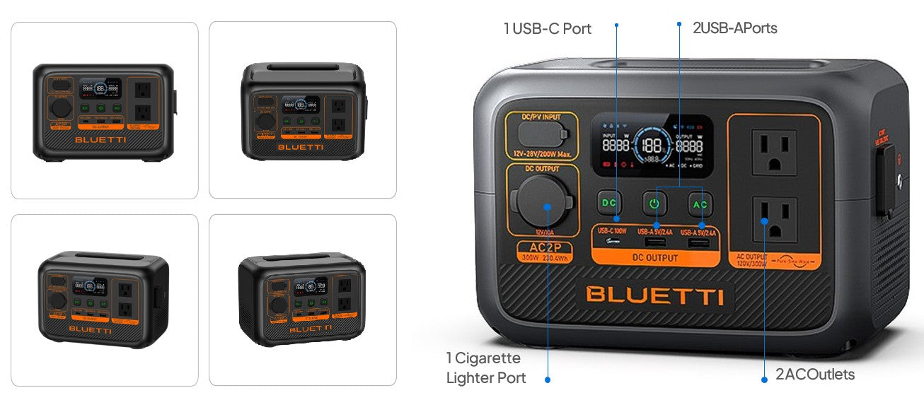 The Bluetti AC2P is a compact and lightweight portable power station with a 230Wh battery that delivers 300W continuous and 600W surge power. It charges quickly in about 1.2 hours using 270W AC Turbo Charging. It offers multiple outlets including AC, USB-A, USB-C, 12V DC, and a car socket for versatile use. Weighing just 3.6kg, it’s easy to carry. The Bluetooth app allows convenient monitoring and control, and built-in safety features protect the battery. Perfect for home backup, outdoor trips, emergencies, and everyday charging needs.