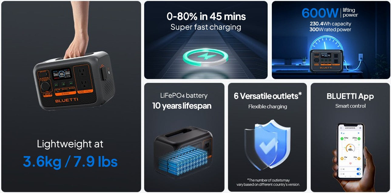 - Capacity & Output: 230Wh LiFePO₄ battery; 300W continuous output; 600W surge power