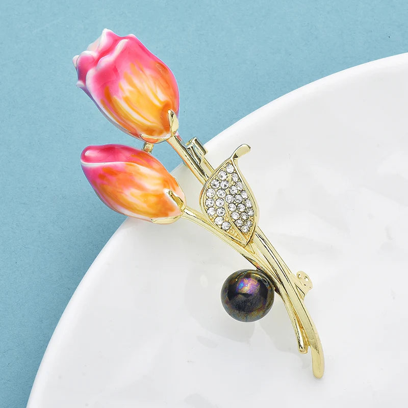 Wuli&baby Enamel Purple Tulip Brooch Pins Gray Pearl Flower Rhinestone Leaf for Women Jewelry Accessory Gift